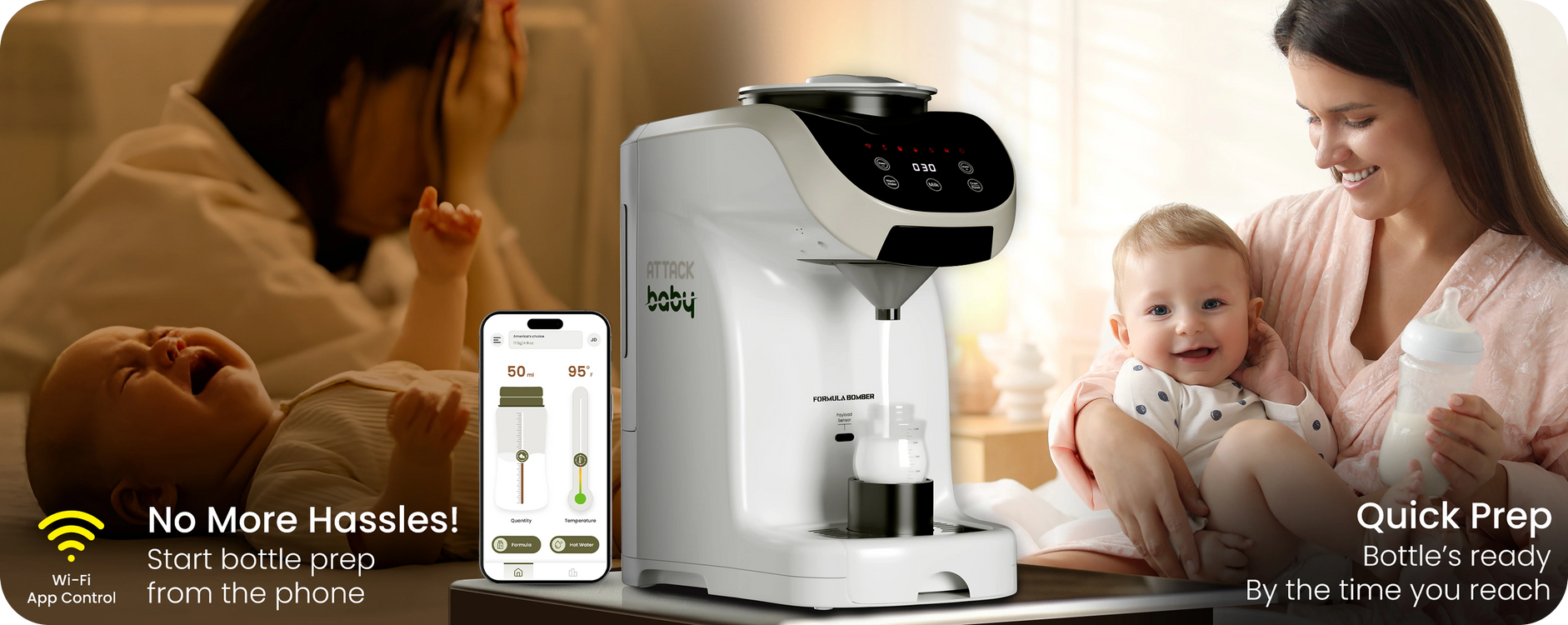 Say goodbye to fussy late-night mixing. Attack Baby’s Formula Dispenser whips up the perfect bottle in just 40 seconds.